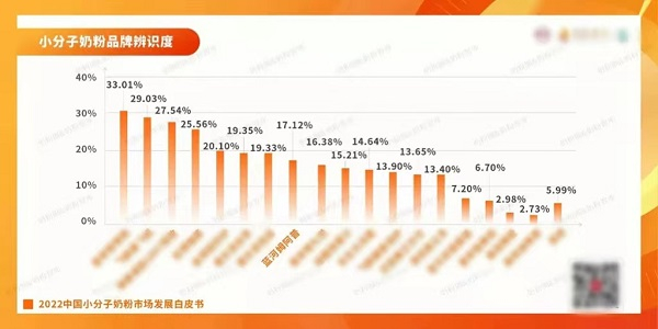2022年12月,中国权威母婴产业创新服务平台奶粉圈&奶粉智库通过深入调查研究,重磅发布业内首份《2022中国小分子奶粉市场发展白皮书》,调研显示,小分子奶粉品牌辨识度排行榜中,蓝河姆阿普奶粉凭借专业底蕴以及产品力上榜前十,受到市场消费者的青睐。