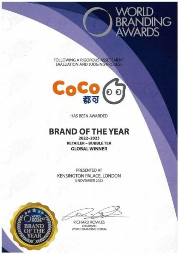 2022年11月3日,由世界品牌论坛(World Branding Forum)主办的世界品牌大奖颁奖典礼(World Branding Awards),在英国皇家宫殿伦敦肯辛顿宫(Kensington Palace)隆重举行,以表扬世界各地成功品牌的超卓表现。CoCo都可荣获被誉为"世界品牌奥斯卡"的“年度世界品牌大奖”。