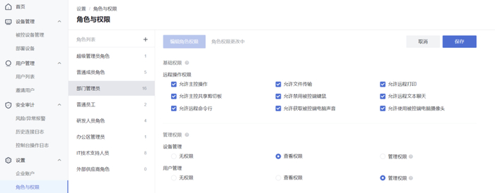还支持按照员工角色批量配置操作权限,避免了管理员重复工作,节省更多的时间成本与人工成本。不同角色可授予不同操作权限。比如普通成员不可以传输文件、复制粘贴、截屏等,规避信息泄露;而管理员可对用户和设备增删改查,进行用户和设备匹配。