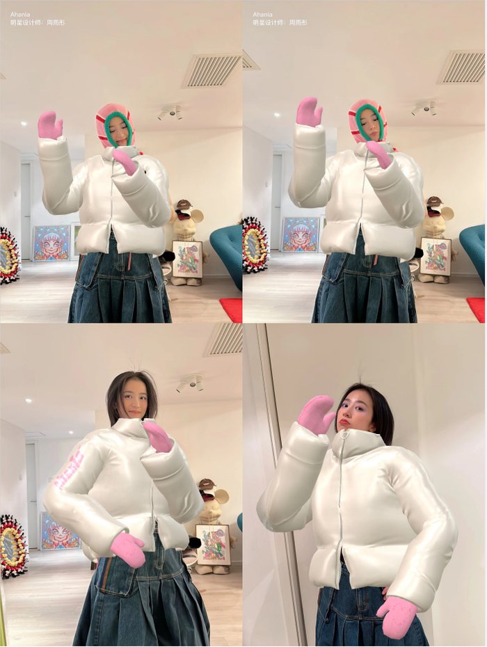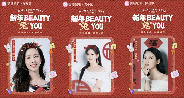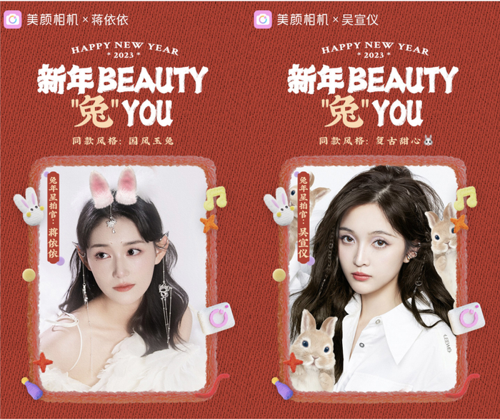 在新春主题产品创作过程中,美图坚持以影像科技驱动内容创新,利用AR技术对传统元素进行创造性转化。「新春放映厅」中的AR贴纸、「数字衣服」贺岁主题系列无不体现美颜相机以科技辅助美学表达的创作导向。同时,美颜相机也与多位明星艺人达成合作。春节期间,陈都灵、陈小纭、陈钰琪、蒋依依、吴宣仪化身“兔年星拍官”,合作推出兔年主题贴纸和妆容,为新春影像创作更添趣味。美颜相机还邀请周雨彤担任明星服装设计师,联动个人潮牌Ahania,共同打造冬日主题虚拟服装,在互动之中表达时尚态度,提供全新的创作体验。