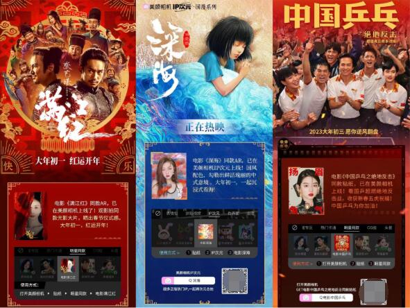 通过对影片中代表性元素的提炼与二创,美颜相机上线了各具特色的主题贴纸。《满江红》角色海报同款AR贴纸,让用户仿佛化身电影中的角色,更具沉浸体验;《深海》作为美颜相机 IP次元国漫系列贴纸,从影片之中汲取中式意境之美,还原电影同款“粒子水墨”视觉艺术效果,为影像拍摄营造创意体验;《中国乒乓之绝地反击》主题贴纸带有满满新春元素,拍摄同款收获新春祝福,一起扬眉“兔”气。