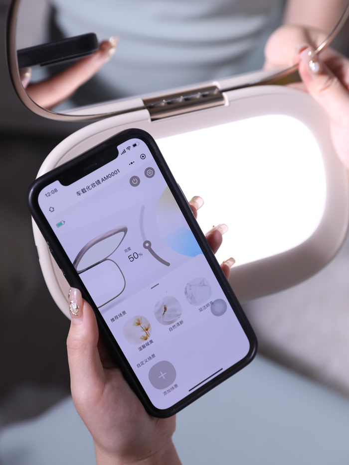 除了设计上独具一格外,与传统车载化妆镜操作方式不同的是,Uait小柚爱途车载化妆镜还搭载了小程序智能调控功能,通过蓝牙链接打开小程序即可智能无极调节亮度,用户可以将自己常用的、喜欢的灯光在小程序上进行预设,后续使用直接调用即可,让用户在车旅出行上更方便。智能无极调节亮度,还解锁了智能车载化妆镜的多种应用场景,车内补光拍照,氛围调光,阅读照明等多种场景自我定义,享受悦己生活的多种“解锁”方式。