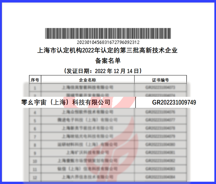 近日,全国高新技术企业认定管理工作领导小组办公室公布了2022年认定的“高新技术企业”名单,零幺宇宙光荣上榜。