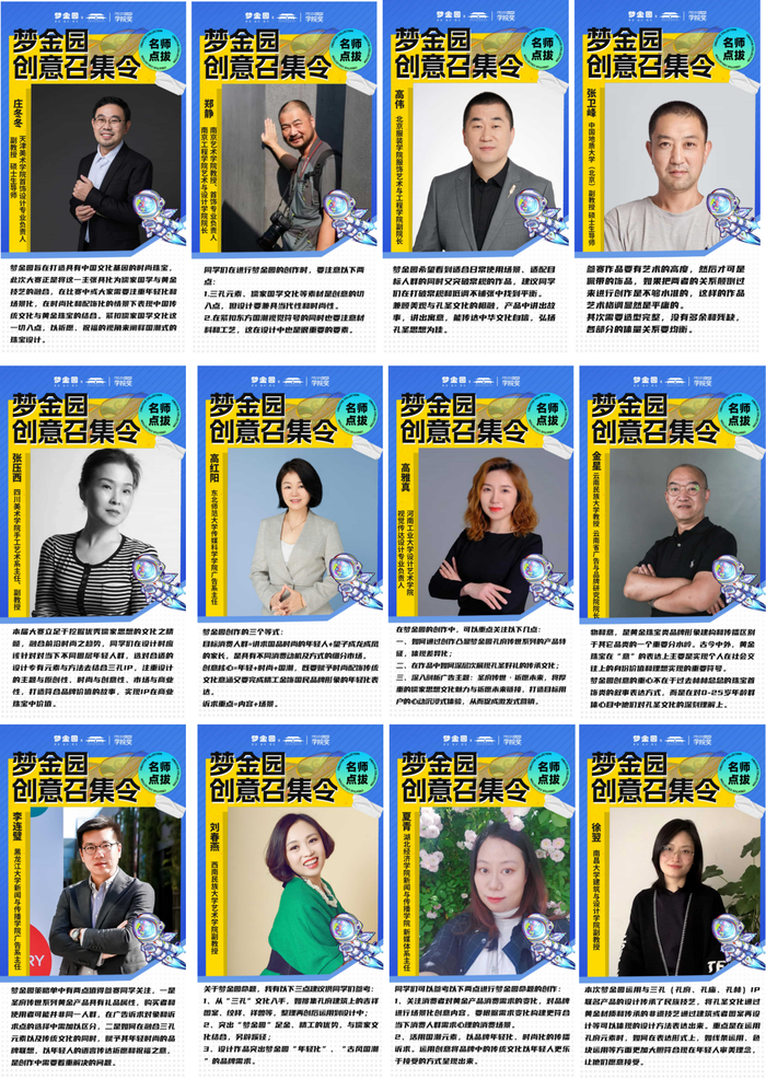 名师力量赋能创意新思维。组委会特别邀请十二位设计、广告名师给出为每一位参赛学子给出专业建议,突破创意瓶颈,勇往直前逐梦国潮。