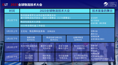 为全方位、多层次、立体化展现前沿物流技术的发展,深入贯彻党的二十大精神,落实“十四五”规划要求,推动“交通强国、数字中国”战略建设,助力“双碳”目标实现,中国物流与采购联合会将于2023年3月1-3日在海口召开“2023全球物流技术大会”,加速新技术在物流行业的应用,加快打造新业态新模式,健全物流体系建设,促进产业链、供应链、价值链深度融合。