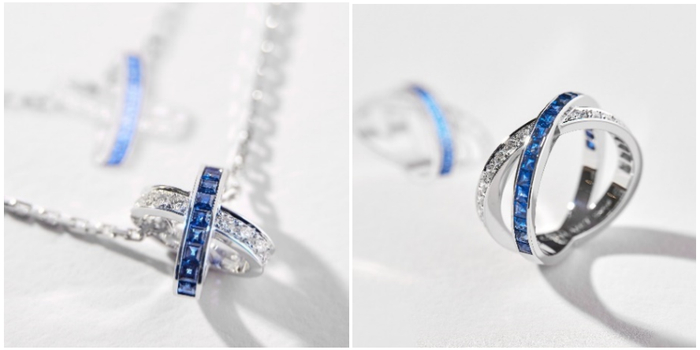 欢·缘全新作品在原有设计基础之上,加缀CHAUMET“皇家蓝”,彰显着CHAUMET“蓝血贵族”的尊贵。CHAUMET采用独特而严苛的蓝宝石遴选标准,精选浓郁度均匀、色彩纯净的蓝宝石。明亮式切割钻石与方形切割蓝宝石,以符合高级珠宝制作标准的工艺进行打造,璀璨光辉与深邃色彩相互映衬,演绎出绝美二重奏;对称且平衡的3D设计让新作更加和谐,镂空为镶嵌带来更多轻盈感,增强了新作的迷人光彩。