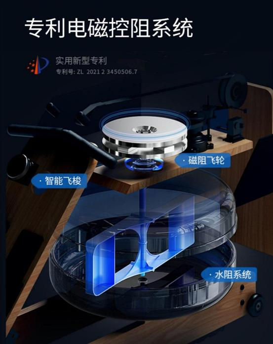 麦瑞克研发专利电磁控阻技术 ,在传统水阻结构中嵌入新型电磁控阻力系统,运动时可以在水阻和磁阻之前任意切换,既保留了磁阻划船机的静音效果和精确的阻力调节,也带来了水阻划船机更加真实的运动体验。