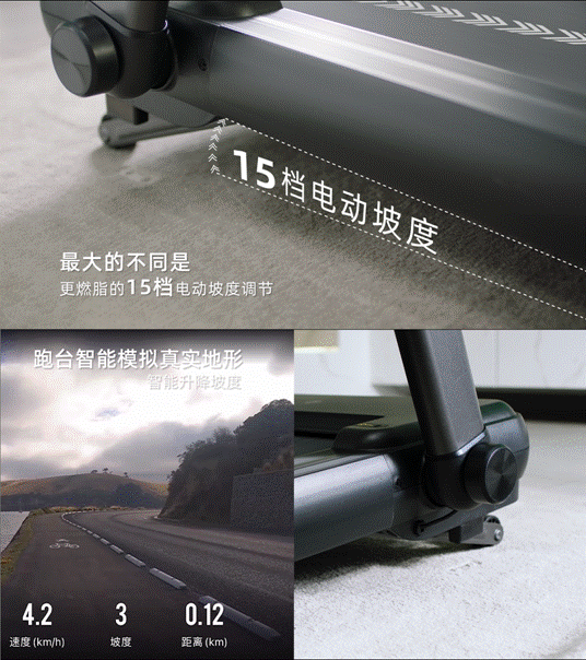跑步机支持15挡电动坡度扬升和全地形坡度模拟,用户可以找到最适合自己的跑步坡度,能有效减少跑步后小腿和膝盖的酸痛,避免运动损伤。