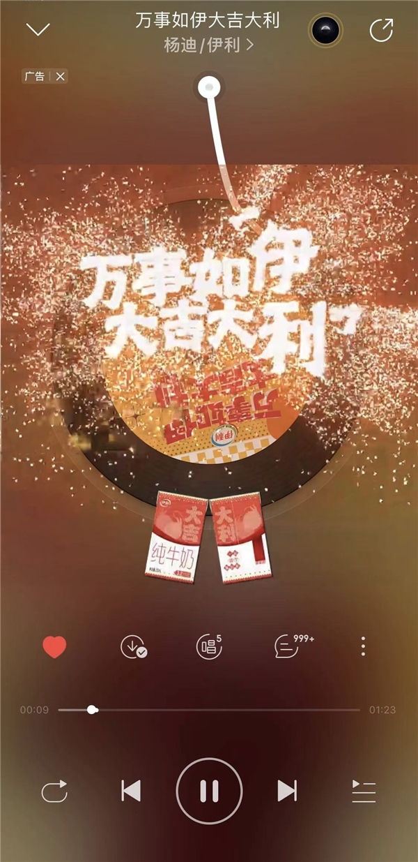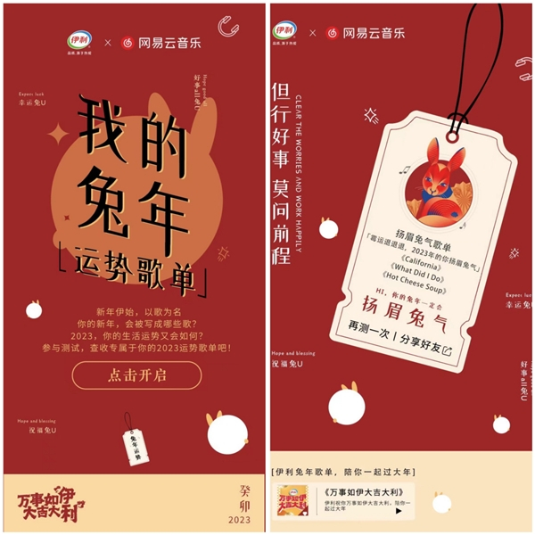 2023兔年春节期间,围绕着新年“万事如伊大吉大利”的主题,网易云音乐联合伊利推出兔年品牌主题曲,邀请艺人杨迪进行歌曲翻唱与评论区互动,更有霸屏、歌曲播放页彩蛋、新年歌单特效等沉浸式新春传播,兔年万事如伊大吉大利运势歌单持续加持,丰富了歌曲的玩法和宣发形式,实现品牌声量和歌曲宣发的双赢传播。此外,本次合作形成包含品牌歌曲在内的伊利新年歌单,与站内UGC歌单发生关联,实现品牌在平台内的长期留存。