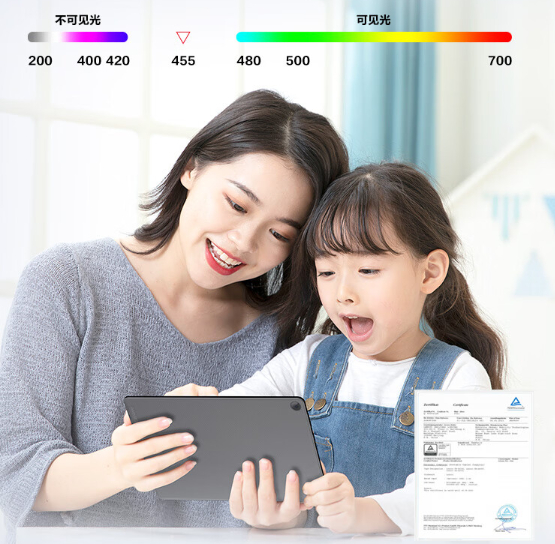 平板电脑虽能为学生带来不少便利,但长时间使用平板电脑,屏幕里的有害蓝光会导致视力下降这一现实问题也令家长们有所顾虑。目前,市面上多数平板电脑普遍采取软件算法来过滤蓝光、减少屏闪和冷光等。不过,这种办法往往会造成屏幕颜色失真、防蓝光感知不强等现象,影响体验感。想要真正做到护眼防蓝光,还是需要在物理层面下功夫。