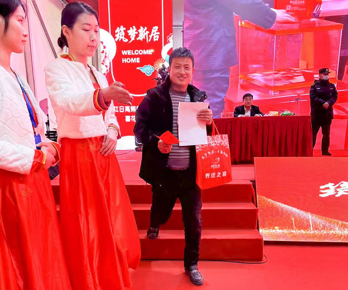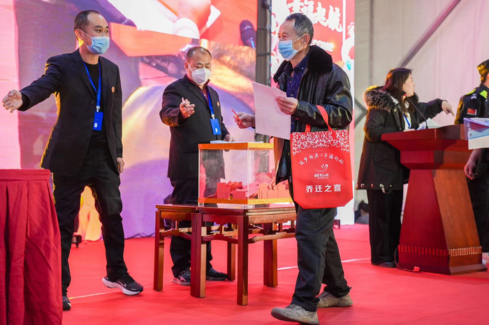 一大早,回迁抓阄仪式现场村民齐聚一堂、喜迎回迁。入口处锣鼓喧天、彩旗飘扬,等待区人头攒动,热闹非凡,个个兴高采烈,脸上洋溢着喜悦的笑容。
