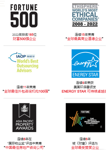 持之以恒的市场深耕,也为仲量联行带来了来自客户与市场的多重肯定。2022年排名185位财富500强企业;连续15年荣膺“全球最具商业道德企业”;连续11年荣膺“全球最佳外包咨询机构100强”;连续9年荣获美国环保署颁发ENERG STAR可持续卓越奖;连续8年在“国际物业奖”评选中荣膺“中国最佳房地产咨询公司”;连续6年被《财富》评选为全球最受赞赏企业......仲量联行以领先市场的业务经营基础和精益求精的客户服务,实现了荣誉加身。