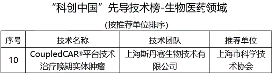 喜报!2022“科创中国”揭榜,斯丹赛实体瘤CoupledCAR技术荣登先导技术榜!