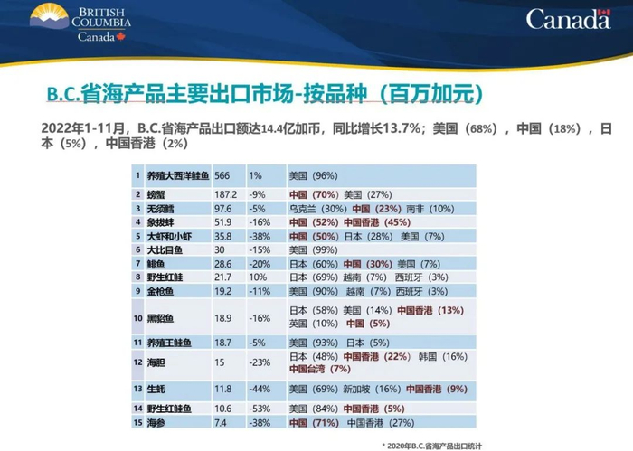 2022年1-11月,B.C.省海产品出口额达14.4亿加币,同比增长13.7%(美国68%、中国18%、日本5%、中国香港2%)。其中对华出口额2.66亿加元,同比增长27.8%;对华出口量达18,278吨,同比增长18.8%。