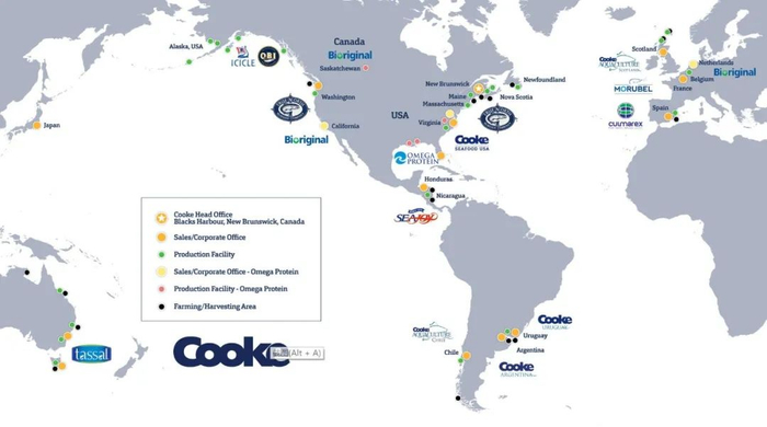 Cooke库克水产公司是一家具有全球影响力的家族企业,总部位于加拿大东海岸的新布伦瑞克省圣约翰市。1985 年,三文鱼养殖在加拿大大西洋地区还是新兴事物,Cooke就构建了三文鱼养殖系统,以便继续供应这种美味可口的鱼类产品。今天,Cooke由最初的加拿大大西洋地区小规模家族水产养殖公司,发展成为了在12个国家的26个生产加工设施,培育收获输送25个品类,10亿磅的海鲜产品,的全球海产品领导者,产品畅销至67个国家。