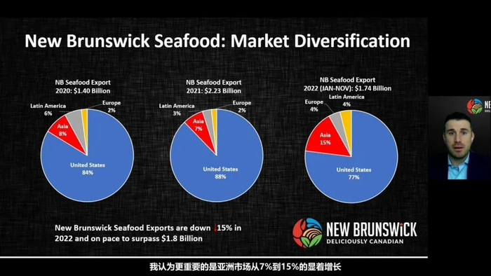 在过去几年省内做了很多努力来增强市场多元化,增加在亚洲和欧洲的销售。从2022年1月到11月数据显示,预计2022年全年的出口总值将超过18亿加元,高于2019年疫情前的出口额。出口亚洲市场的比例从7%到15%,增长显著,并且欧洲市场的比例也从2%增长到了4%。
