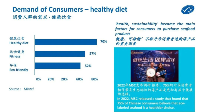 2022年MSC发布调研报告,75%的中国消费者相信带有生态标识的海产品是更加有益于健康的选择。可持续发展加拿大海鲜产品在未来将在中国餐饮和零售市场中占有重要的地位。
