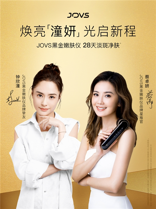 2月6日,「JOVS黑金嫩肤仪品牌推荐官」蔡卓妍加入JOVS 明星大家庭,和「黑金嫩肤仪品牌挚友」钟欣潼一起,共同探索面部净白无瑕,开启肌肤发光之旅。