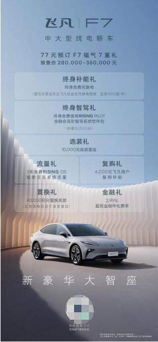 近期,上汽集团重磅打造的新能源汽车飞凡F7在上海潮流地标TX淮海惊艳首秀,正式开启预售,预售价格区间为28-35万元,新车定位为中大型纯电动轿车,其分为600km和666km两种续航版本,并且分为单电机、双电机和换电车型。现在预订,仅需77元即可获得飞凡F7“福气席位”,解锁终身免费充换电、终身免费智驾软件服务、一万元选装基金等七重权益,开启新年新“福气”。