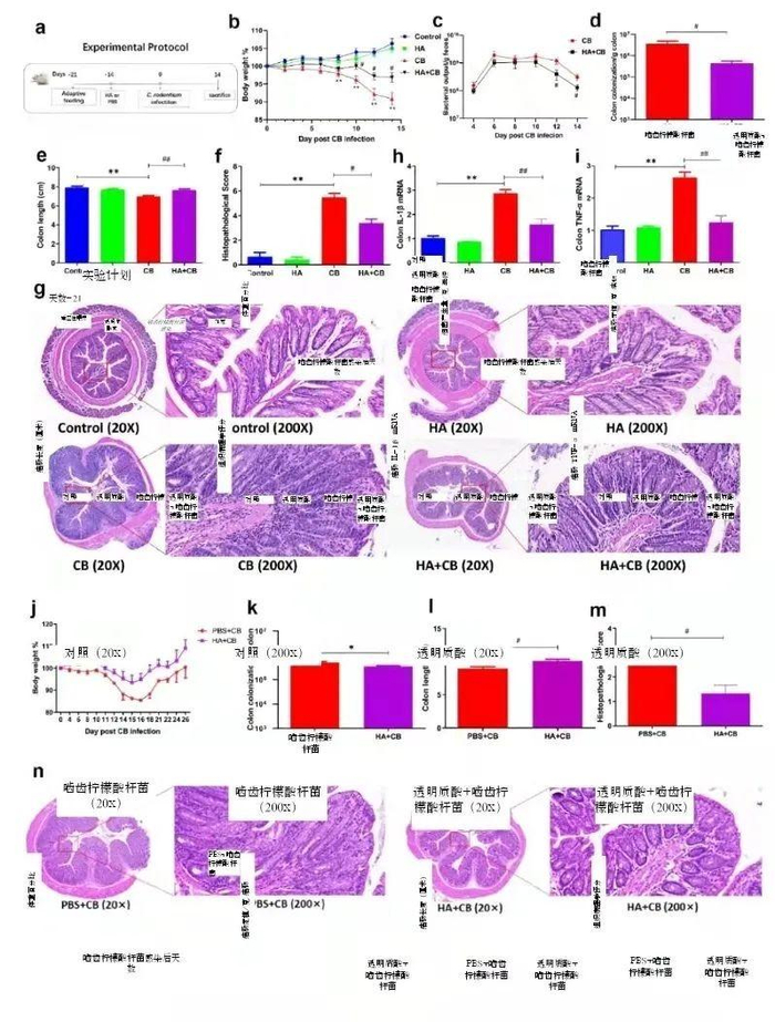 图示:经透明质酸处理的小鼠的微生物移植表明了透明质酸对由啮齿柠檬酸杆菌诱导的结肠炎的小鼠的影响