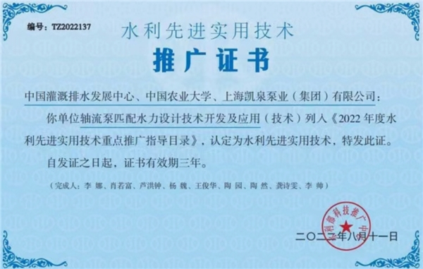 2022年8月11日,凯泉泵业集团轴流泵匹配水力设计技术开发及应用(技术)列入《2022年度水利先进实用技术重点推广指导目录》。