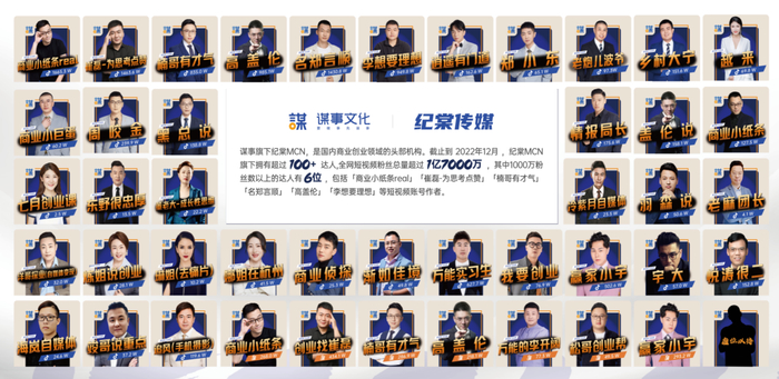 除了【名郑言顺】以外,谋事文化旗下纪棠MCN机构还孵化了超过100位达人,是国内商业创业领域的头部机构。