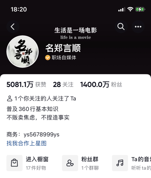 【名郑言顺】账号粉丝量1400万,这是什么样的概念?大概就是在中国每160人左右就有一个人会是【名郑言顺】的粉丝。每一个粉丝又会影响到身边3-5个亲人朋友,这样一算,这个账号带来的连锁传播效应不亚于一个国内知名媒体频道。