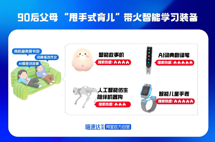 这波“甩手式育儿”在开学季消费也同样得到了印证。不同于往年护眼台灯、学习桌、打印机等硬件装备畅销,90后父母当道,各式智能学习装备在今年迎来了一波消费热潮。记者从阿里官方自营的喵速达电器了解到,开学季以来,AI词典笔、智能故事机、智能儿童手表等搜索量飙升540%。