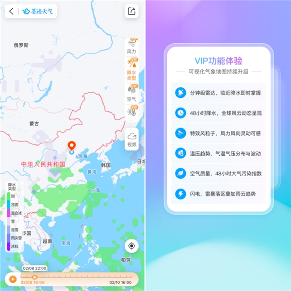 目前,在墨迹天气9.0版本中已经上线了包含降水、风力、降水类型、空气、温度、气压及地震等7种气象要素的可视化图层。天气情况以地图形式显示,用户可以直观生动地观测到全球任意位置的天气即时动态。以最新上线的“降水类型”为例,会员用户可以提前查看未来48小时逐小时的雨、雪、雨夹雪等天气趋势。直接在地图上拖拽,还可以移动到想要观看的位置,直接读取精确到公里级与分钟级的沉浸式气象预报,更全面地了解许多天气预报中没有的数据细节,满足用户获取更直观、更精细气象信息的需求。