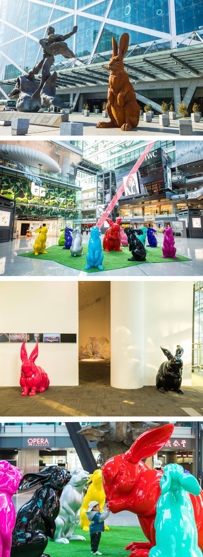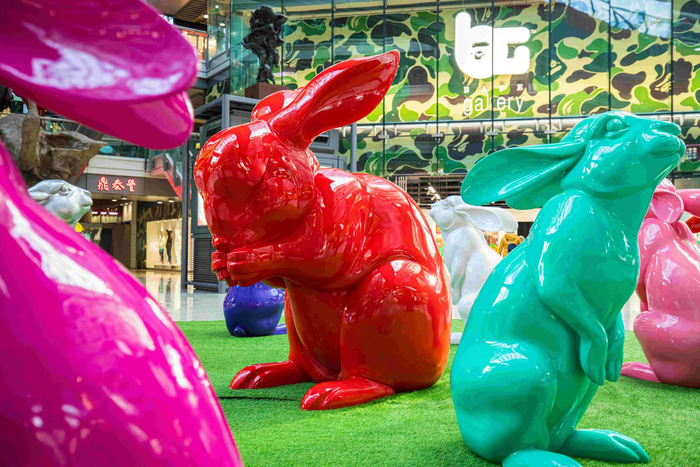 侨福芳草地打破艺术边界,联合当代艺术家刘若望以“福兔”公共艺术展开启新年,用艺术赋予商业多重价值。展览由十六只兔子组成,其中一只高达6米的巨兔驻立在芳草地东门外入口处,祈盼福瑞;十三只五彩缤纷的小兔嬉戏于馆内LG2层中庭草坪,活力盎然;两只彩兔安坐在L10层美术馆门前,充满意趣。艺术家希望以兔子温柔敦厚、萌趣可爱的形象抚慰大众心灵,感知世界的生息,思考所有生命个体的意义。“福兔”公共艺术装置的落地,充分体现芳草地商业与艺术的共生共融,在丰富城市生活的同时,打破了艺术的距离感,促进城市文化发展,让公众在商业空间中收获艺术美学。