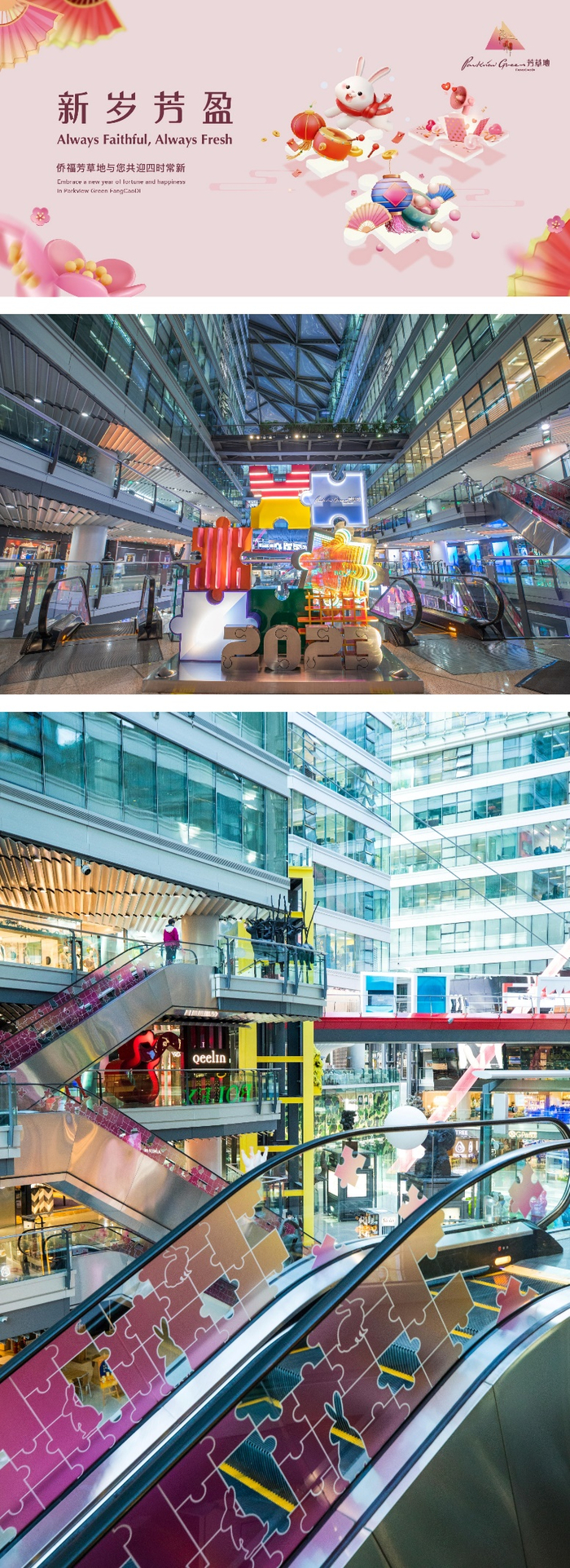 即日起,步入芳草地东门便可发现点缀其上的粉红拼图装饰与“福兔”剪影,同时,这些“福兔”也“跳跃”于馆内扶梯、观光梯上营造浓浓新春节日气氛;进入馆内,由“2023”及“多彩拼图”元素构成的装置映入眼帘,多块拼图代表侨福芳草地为公众提供的多元服务与体验,拼绘出美好生活的理想。馆内多家商户橱窗也焕然一新,喜迎兔年,吸引了众多消费者驻足观赏。