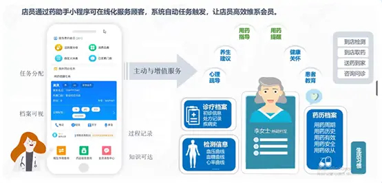 全亿健康慢病会员服务系统是基于企业微信和微信的一体化运营系统,通过免费健康检测、会员建档、回访、药事服务、健康服务等,为会员提供标准化、规范化、个性化的全生命周期的健康管理服务,同时提醒病患按时服药和血压/血糖等常态监测,提高慢病会员的用药依从性。目前慢病会员服务系统正在试运行阶段,2023年3月1日将正式启动全国慢病会员服务工作。