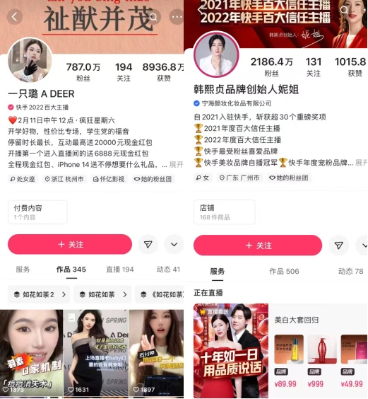 代表案例是@一只璐以及@韩熙贞。前者通过剧集走红,自然承接内容-电商的营销模式,但在剧集植入、电商带货之外,@一只璐也会开展品牌的电商商业化合作。后者则反其道而行之,本身就是达人的@韩熙贞拥有自创品牌,但也会加入快手整体营销体系中,通过口碑传播提升个人及品牌形象。