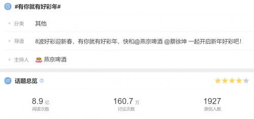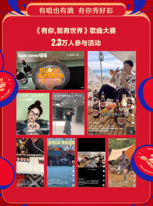 承载燕京精神的“有你文化”代表着燕京人对产品精益求精的目标追求,忠实地为消费者提供高品质的产品、高质量的服务,不断满足人民群众对生活的美好向往。截止至发稿日,燕京啤酒2023年CNY营销线上线下曝光人次超50亿,主话题#有你就有好彩年#在微博的话题阅读量达到了8.9亿,牢牢占据了春节营销的社交C位,将年味推至高潮。