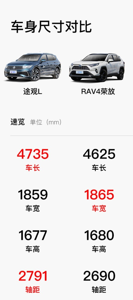 途观L(Tiguan L)的长宽高尺寸为4735x1859x1677mm,轴距为2791mm,RAV4荣放车身尺寸为4625x1865x1680mm,轴距为2690mm。可以看到,途观L(Tiguan L)2023款在车长及轴距上有着一个十分明显的优势,而这样的优势相对也会提升座舱的内部空间。