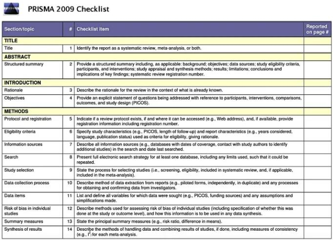 ②系统综述/系统评价(systematic literature reviews): 是指通过特定方法,检索、筛选和评价相关研究,从中提取研究数据并采用合适的统计学方法合并数据,得出综合性结论,较传统综述进行了定性。系统评价需要符合PRISMA声明,PRISMA声明是一个基于证据的指南,包括一个详细清单和流程图。