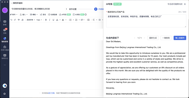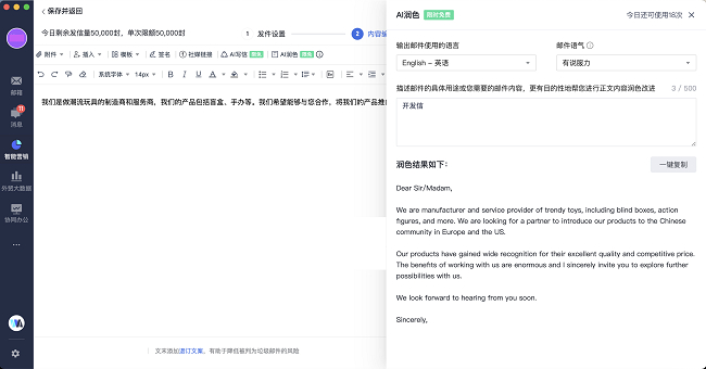 在网易外贸通邮件营销写信页面,可直接借助类ChatGPT功能创建邮件和润色邮件内容。并且,创作内容后支持一键发送,有效提高了外贸人的工作效率。
