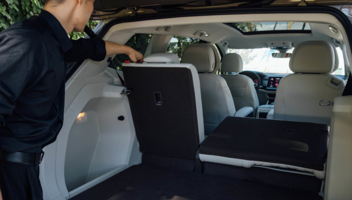 再来到后备厢,储物空间也是让我很满意的,再保障车内7人满员的情况下,威然的后备厢依旧有着很大的纵深优势,第三排座椅支持4:6比例放倒,进一步扩展后备厢空间。