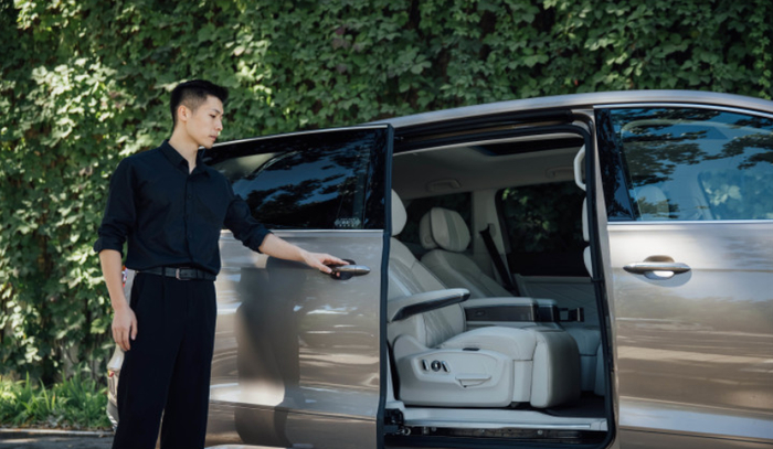 威然车身长5346mm,这台试驾车是顶配车型,所以在前门的位置会有“FLAGSHIP”的旗舰身份表示。它还配备了20时的车轮,我查了一下威然全系的车轮尺寸是18-20时,而GL8只提供17-19时的车轮。在侧面还可以很明显的看到威然采用了隐私玻璃,不论后面是坐家人还是坐客户,都能提供较好的隐私空间。