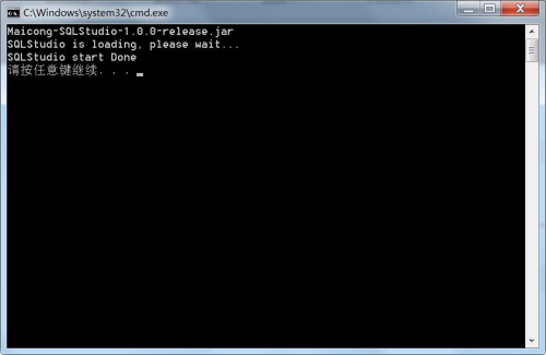 双击之后,系统会弹出一个命令行窗口,显示“SQLStudio Start Done”,即为启动成功,点击任意键可关闭这个窗口。