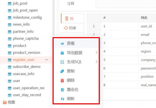 2、数据表管理: 针对数据表可以执行查看、导出数据、生成SQL、复制、删除、重命名和刷新等操作。