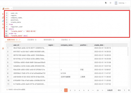 比如,要查询2022年2月1日至今注册客户信息,包括ID、区域、姓名、职位和时间等。