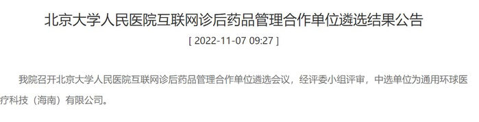 2023年1月20日,伴随第一张外延处方正式开出、流转,通用技术环球医疗与北京大学人民医院合作建设的互联网诊后药品管理项目落地,正式为患者提供服务。