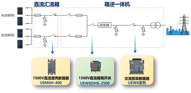 1、集中式光伏发电系统主要应用于大型地面光伏电站、山地光伏电站等场景,而DC1500V系统已成为大型光伏项目降本增效的必要条件。宏发集中式光伏发电系统解决方案包含1500V直流塑壳断路器UEM6H、1500V直流隔离开关UEW6DHG和框架断路器UEW6系列产品,其中DC1500V断路器产品可靠性高、体积小、能耗低,在发电系统中配合使用不仅大大提高了安全性,还减少了不必要的消耗。