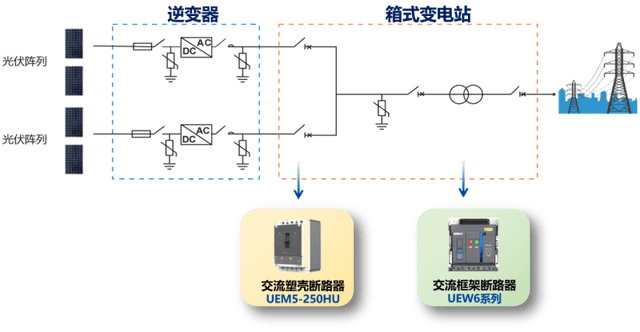 2、组串式光伏发电系统有系统损耗小、发电量高、系统配置灵活、维护方便等特点,在分布式系统中具有一定的优势,主要应用于工商业屋顶光伏电站、农/渔光互补光伏电站等场景。宏发塑壳断路器UEM5-250HU、框架断路器UEW6凭借高可靠性能为组串式光伏发电系统提供安全保障。