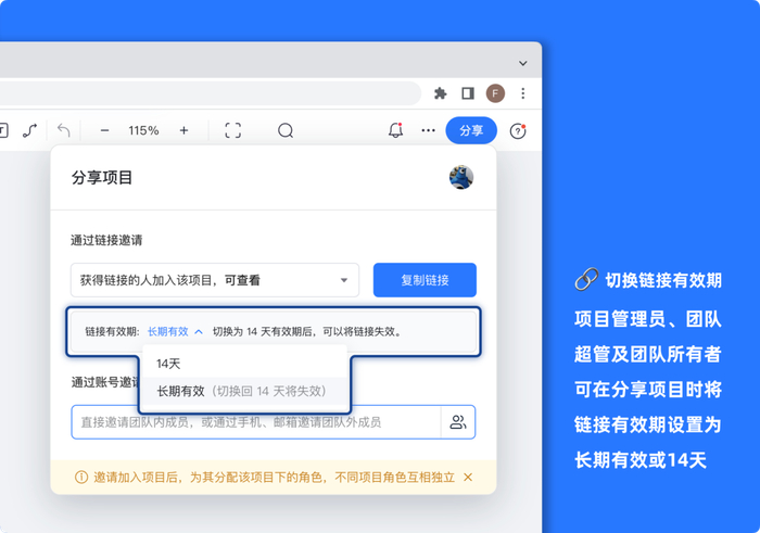 蓝湖已支持将分享链接设置为「长期有效」,项目管理员、团队超级管理员和团队所有者都可以在分享项目时,根据需求将链接有效期设置为「14天」或「长期有效」。