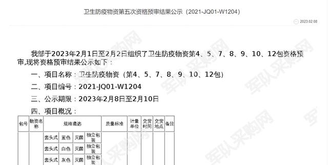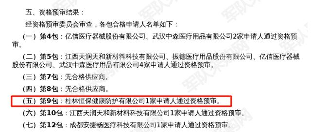 2月8日,军队采购网公布了卫生防疫物资第五次资格预审结果公示,第九包一次性医用外科手套,恒保防护是唯一一家通过资格预审的企业。