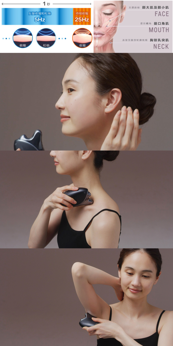 此外,EH-SP85具有容易接触到EMS电极的科学形状设计。考虑到EMS电极的易对准性,松下科学地研究了刮痧板的形状,能轻松对准使用者的在意部位,并向上提拉移动从而取得锻炼肌肉的实际体验。无论从面颊、面部轮廓线、法令纹等面部周围到从脖颈至锁骨的部位、上臂及身体,均可使用这台美容仪进行护理。