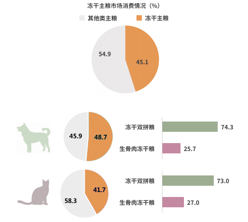 据朗诺与派读调研数据显示,目前,宠物冻干类产品在主粮、零食市场的偏好度均持续提升,冻干主粮在犬、猫粮中的渗透率分别为 48.7%、41.7%,冻干零食的渗透率则为 45.4%。其中冻干双拼粮仍是最受宠物主欢迎的主粮产品,猫冻干主粮及零食市场仍有较大的增长空间与市场潜力。