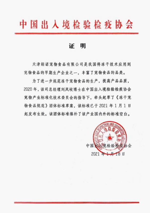 朗诺作为国内率先将国际前沿冻干技术应用于宠物食品研发及生产的企业,始终以推动冻干宠物食品行业规范、引领产业升级为己任。早在2021年1月在宠工委的指导下,由朗诺领衔起草制定《冻干宠物食品规范》正式颁布实施,为中国冻干宠物食品树立细分行业标准。
